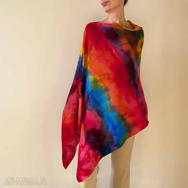 Unikatowe, ręcznie barwione ponczo z najwyższej jakości wełny z merynosów. Uniwersalne, na każdy sezon, na każdą sylwetkę i rozmiar. Do noszenia na co dzień i na wieczorowe wyjście. Doskonałe jako wierzchnie okrycie na wiosenne, letnie, czy jesienne chłody, a w zimie w charakterze swetra. Idealny na prezent dla Niej.