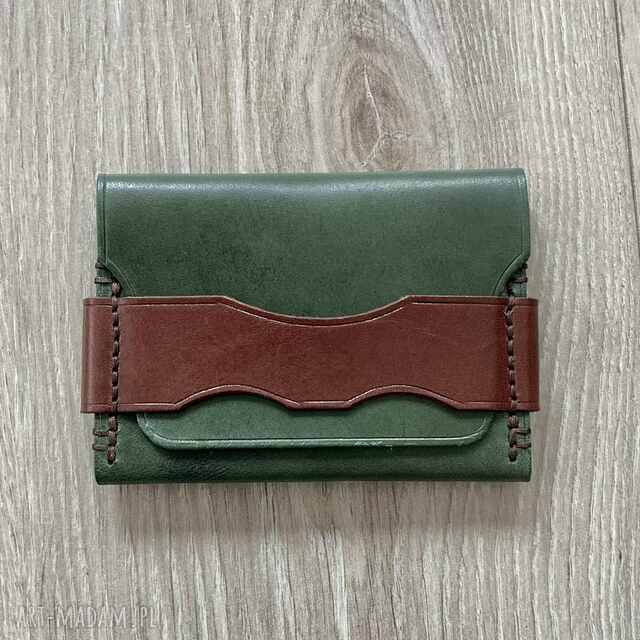 Zielono-brązowy portfel minimalistyczny na karty wykonany ze skóry.