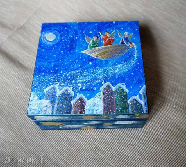 Drewniane pudełko na różności z reprodukcją obrazu autorskiego pt. "Śnieg nad miastem". Obraz umieszczony jest metodą decoupage na wierzchniej części szkatułki, boki natomiast malowane są ręcznie. Całość zabezpieczona jest bezbarwnym lakierem oraz sygnowana w środku.