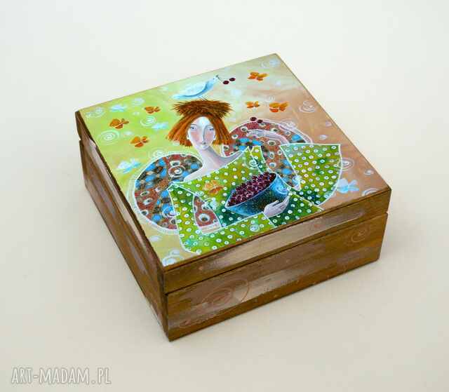 Drewniane pudełko na różności z reprodukcją obrazu autorskiego pt. "Smak lata". Obraz umieszczony jest metodą decoupage na wierzchniej części szkatułki, boki natomiast malowane są ręcznie. Całość zabezpieczona jest bezbarwnym lakierem oraz sygnowana w środku.