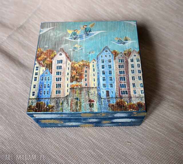 Drewniane pudełko na skarby, ze zdjęciem obrazu umieszczonym metodą decoupage na wierzchniej części. Boki szkatułki ręcznie malowane. Całość zabezpieczona wiele razy bezbarwnym lakierem. Szkatułka sygnowana w środku.