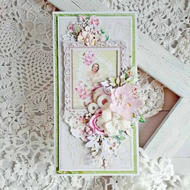 Każda kartka posiada unikalną kompozycję, wykonaną z delikatnej koronki oraz eleganckich kwiatków. Nie ma dwóch identycznych kartek — każda jest jedyna w swoim rodzaju.