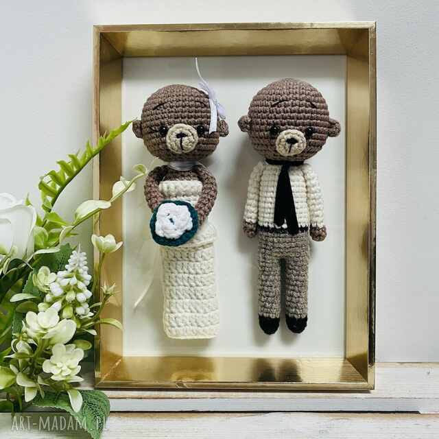 Młoda Para - misie maskotki w złotej ramce ręcznie robione na szydełku - idealny prezent ślubny