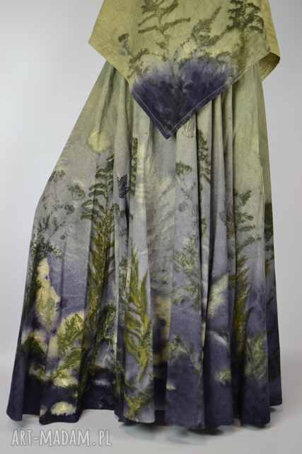 Spódnicę stworzyłam w procesie naturalnego barwienia roślinami techniką ecoprintu - druku kontaktowego. Do jej stworzenia użyłam ziela nawłoci, krwawnicy, paproci, liści sumaka i klonu. Wyjątkowe łąkowe tło stworzone z wywarów z drewna modrzejca i ziela wrotyczu.