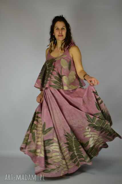 Spódnicę stworzyłam w procesie naturalnego barwienia roślinami techniką ecoprintu - druku kontaktowego. Do jej stworzenia użyłam liści sumaka, które oddały swoje kształty i esencję tkaninie. Rozkoszne różowe tło barwione wywarem z brezylki.