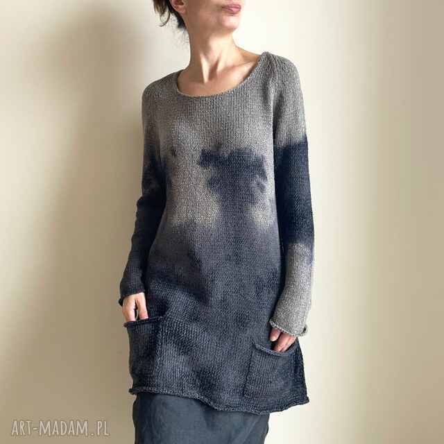 Unikatowy, ręcznie barwiony, dzianinowy sweter/tunika/sukienka z mieszanki naturalnych przędz. Kształt trapezowy, poszerzony do dołu.