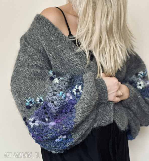 Kardigan z szerokimi rękawami. Włóczka, z której zrobione są przody i tył kardigana to luksusowe połączenie czesankowej superfine alpaca (77 %) i delikatnie lśniącego jedwabiu (23 %). Sweter jest miękki, ciepły i puchaty. Szerokie rękawy ozdobione są wstawkami wykonanymi za szydełku. Kolor podstawowy: pistacjowy. Motyw kwiatowy na rękawach wykonany jest z włóczek, które w swoim składzie mają naturalne włókna: alpakę, moher, merynos oraz z włóczek fantazyjnych z niewielką domieszką włókien sztucznych.
