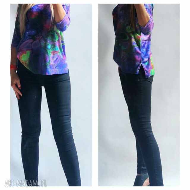 Letni sweterek z okrągłym dekoltem wykończony plisa tunelową, rękaw 3/4 przylegający, boki wykończone ozdobnymi pęknięciami po obu stronach sweterka.