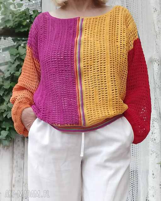 Kolorowa, bawełniana bluzka, krótki sweterek na lato, wykonany ręcznie na szydełku, z bawełny 100 %, wzorem z dużymi oczkami, przewiewny i luźno się układający. To propozycja na wakacyjne i letnie stylizację. Bluzka świetnie się komponuje z białymi szerokimi spodniami, z jeansami i długą spódnicą.