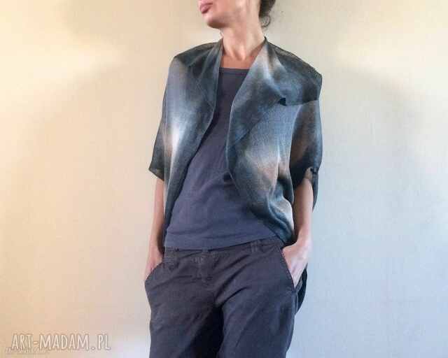 Unikatowy, ręcznie barwiony dzianinowy sweter ze 100% wysokiej jakości lnu. Uniwersalny one size kardigan, który można zarzucić w ciągu dnia do dżinsów, jak i na wieczorne wyjście do eleganckiej sukni. W letnie dni ochroni przed słońcem, wieczornym chłodem, czy nadmorskim wiatrem. Możesz szybko zarzucić go na ramiona, a nada stylu każdemu strojowi. Wspaniały upominek dla drogiej osoby. Dobrze komponuje się z szalem w tych odcieniach.