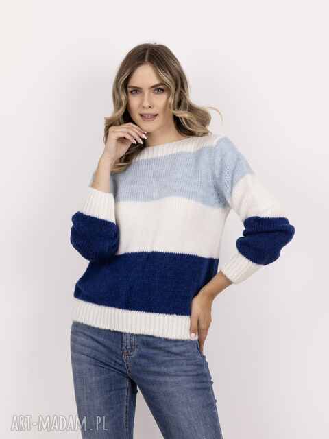handmade sweter w szerokie, kontrastowe pasy - swe290 ecru/kobalt/błękit mkm