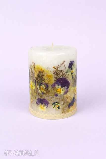 ręcznie robione żółto - fioletowa świeca botaniczna z bratkami i pierwiosnkiem