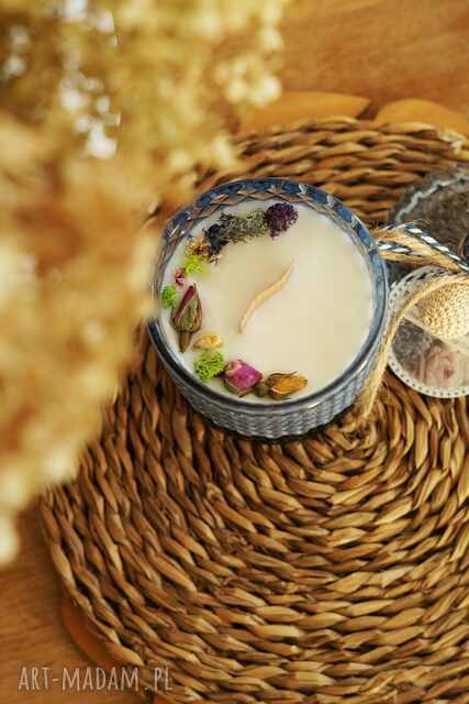 1. OPIS WYROBU - świece wykonane z naturalnych wosków (sojowy, rzepakowy, pszczeli, kokosowy) topionych w kontrolowanej temperaturze i wylewanych ręcznie do żaroodpornych naczyń szklanych lub porcelanowych naczyń pozyskanych na pchlich targach. Świeca zawiera bawełniany lub drewniany knot, wzbogacona zapachem z certyfikowanych olejków eterycznych oraz dekorowana suszonymi roślinami.