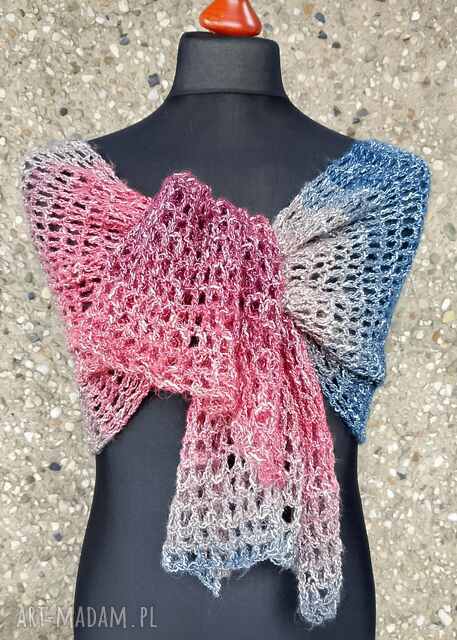 Piękny szal wykonany w całości ręcznie z delikatnej w dotyku cieniowanej włóczki z dodatkiem srebrnej nitki. Kolory doskonale współgrają z sobą, tworząc ciekawy efekt. Zastosowano klasyczny siateczkowy wzór. Szal może być noszony zarówno do codziennych jak i wieczorowych stylizacji. Będzie wyjątkowym prezentem dla wyjątkowej osoby.