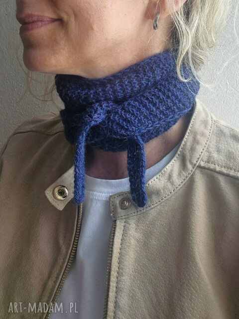 Elegancki mini szalik wykonany ręcznie na drutach z naturalnej włóczki 100% alpaka. Jego wymiary to 130 x 14 cm, dzięki czemu jest lekki, wygodny i idealny do noszenia na co dzień.