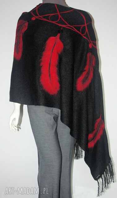 Szal w kolorze czarnym zrobiony na maszynie dziewiarskiej, z dobrej jakościowo przędzy. Aplikacja wykonałam ręcznie pracochłonną metodą filcowania na sucho. Idealny na zimę, oraz do okrycia ramion podczas imprez okolicznościowych.