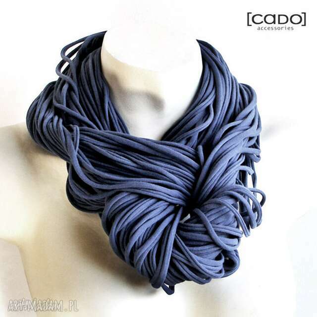 ZAMOTKA CADO forma biżuteryjno - odzieżowa, która w zależności od kontekstu staje się Dzianinowym Naszyjnikiem, Szalem, Apaszką. Wielość rozwiązań zależy jedynie od kreatywności Właściciela :) Poszczególne pasma można rozdzielać i nosić tylko kilka. Zamotka ma 20 ręcznie wykonanych dzianinowych pasm o obwodzie - 225 cm. Poszczególne pasma można zamotać wokół szyi 2 lub 3krotnie, dzięki czemu uzyskamy naszyjnik o objętości 40 lub 60 pasm. Materiał: 100% Bawełna; Kolor: PRZYDYMIONY NIEBIESKI