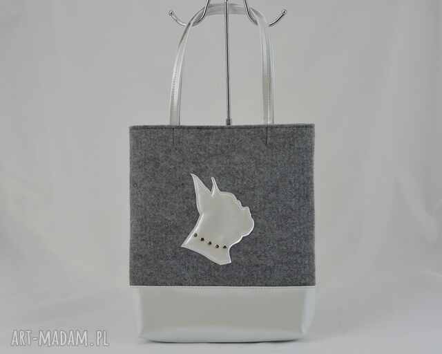 Torebka została wykonana z grubego i mocnego filcu. Prosta, minimalistyczna forma. Torebkę zdobi ręcznie wycinany pies z materiału przypominającego lateks. Rączki oraz spód torebki są obszyte tym samym materiałem - są bardzo mocne.