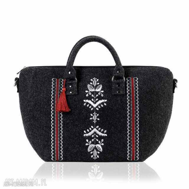 Kuferek ze wzórem, który jest autorskim pomysłem inspirowanym klimatem etno. Uważny obserwator dopatrzy się w nim motywów roślinnych, przywodzących na myśl polne kwiaty. Hafty odznaczają się świeżą, nasyconą kolorystyką, jaka dominuje w modzie w bieżącym sezonie. Charakterystyczną cechą marki Farbotka są barwne chwościki, których nie zabrakło i w tej kolekcji. Ponadto torebki mają ciekawy, łódkowy kształt. Wykończono je filcowymi rączkami oraz paskiem do przewieszenia przez ramię który można regulować.