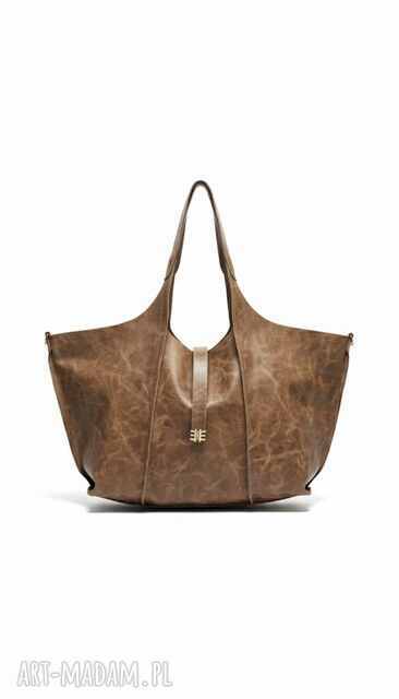 Torebka została wykonana z wysokiej jakości skóry naturalnej o charakterystycznej, przecieranej/postarzanej fakturze w ciepłym, brązowym odcieniu. To wykończenie sprawia, że jest odporna na codzienne użytkowanie, a jej wygląd z czasem zyskuje na unikalności. Przód zdobi dekoracyjny, pionowy pasek z metalowym, złotym okuciem o geometrycznym wzorze, które pełni funkcję zapięcia. Solidne szwy i przemyślana konstrukcja gwarantują trwałość na lata.