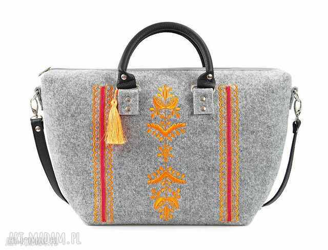 Wiosenną pogodę Farbotka wita nową kolekcją filcowych torebek, pojawił się zupełnie nowy wzór, który jest autorskim pomysłem inspirowanym klimatem etno. Uważny obserwator dopatrzy się w nim motywów roślinnych, przywodzących na myśl polne kwiaty. Hafty odznaczają się świeżą, nasyconą kolorystyką, jaka dominuje w modzie w bieżącym sezonie. Charakterystyczną cechą marki Farbotka są barwne chwościki, których nie zabrakło i w tej kolekcji. Ponadto torebki mają ciekawy, łódkowy kształt. Wykończono je skórzanymi rączkami oraz paskiem do przewieszenia przez ramię który można regulować.