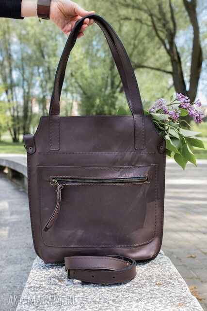 Piękna torebka, wykonana ręcznie ze skóry naturalnej w kolorze brązowym. Torebka jest w prostym ale bardzo oryginalnym stylu. Bardzo pojemna, lekka, zmieści wszystkie niezbędne przedmioty, których potrzebuje kobieta. Posiada odpinany pasek na regulację, dzięki czemu można ją nosić zarówno na ramieniu, jak i na ukos. Główna część zapinana na zamek, w środku posiada kieszeń. Sprawdzi się idealnie do szkoły, pracy, a także na ważne spotkanie.
