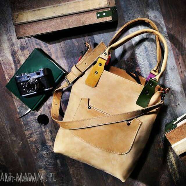 Mam dla Was piękną torebkę, wykonaną ręcznie ze skóry naturalnej w kolorze beżowym z różnokolorowymi dodatkami. Torebka jest w prostym ale bardzo oryginalnym stylu. Bardzo pojemna, lekka, zmieści wszystkie niezbędne przedmioty, których potrzebuje kobieta. Posiada odpinany pasek na regulację, dzięki czemu można ją nosić zarówno na ramieniu, jak i na ukos. Główna część zapinana na zamek, w środku posiada kieszeń. Sprawdzi się idealnie do szkoły, pracy, a także na ważne spotkanie.