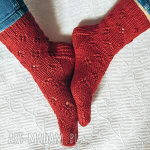 Damskie skarpetki w kolorze czerwonym wykonane na drutach z najwyższą starannością metodą bezszwową z wysokiej jakości miękkiej i delikatnej wełny (z domieszką poliamidu, dzięki czemu nie przecierają się).