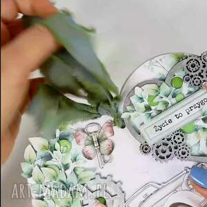 Całość utrzymana jest w zielono-srebrnej kolorystyce. Z tyłu umieściłam niewielką kopertę na banknoty lub życzenia (wymiary koperty: 10,5 x 8,5 cm).