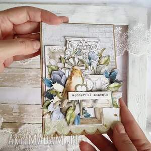 Każda kartka posiada unikalną kompozycję, wykonaną z delikatnej koronki oraz eleganckich kwiatków. Nie ma dwóch identycznych kartek — każda jest jedyna w swoim rodzaju.
