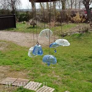 Szklane, nieregularne dzwoneczki poruszają się delikatnie przy ruchu powietrza, zmieniając układ i odbicia światła.