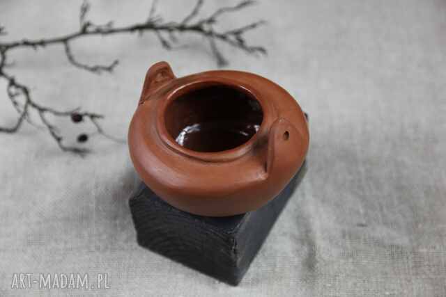 Ręcznie modelowane, dlatego miejscami nierówne. Szkliwione wewnątrz, na zewnątrz polerowane. Naturalny kolor terakoty. Średnica ok. 14 cm, wysokość ok. 8 cm. Uszka z dziurkami.