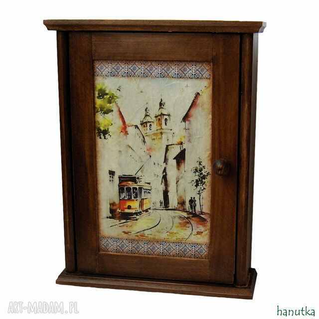Stylowa szafka na klucze ozdobiona techniką decoupage motywem lizbońskiego tramwaju. Bejcowana na kasztan, przecierana, lekko patynowana. Wewnątrz motyw z tradycyjnych portugalskich kafli. Pokryta wielokrotnie ekologicznym lakierem akrylowym z lekkim połyskiem, motywy matowe.