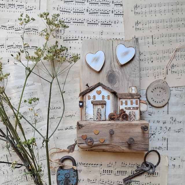 Rustykalny wieszak z białymi domkami