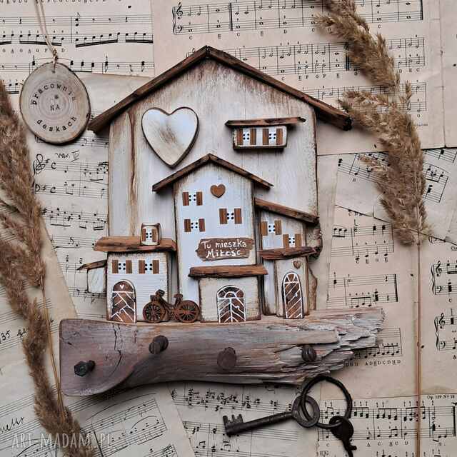 Dla wszystkich wielbicieli drewna i naturalnych dekoracji proponuję rustykany trójwymiarowy wieszak z domkami.