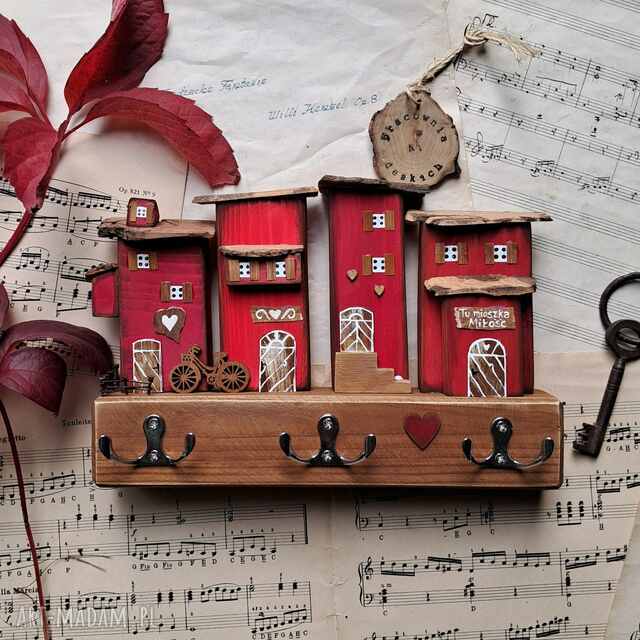 Wieszak w którym mieszka miłość no1. Wieszaki handmade Wieszak z domkami w odcieniach czerwieni wykonany z drewna, przecierany każdy domek inny200,00 zł