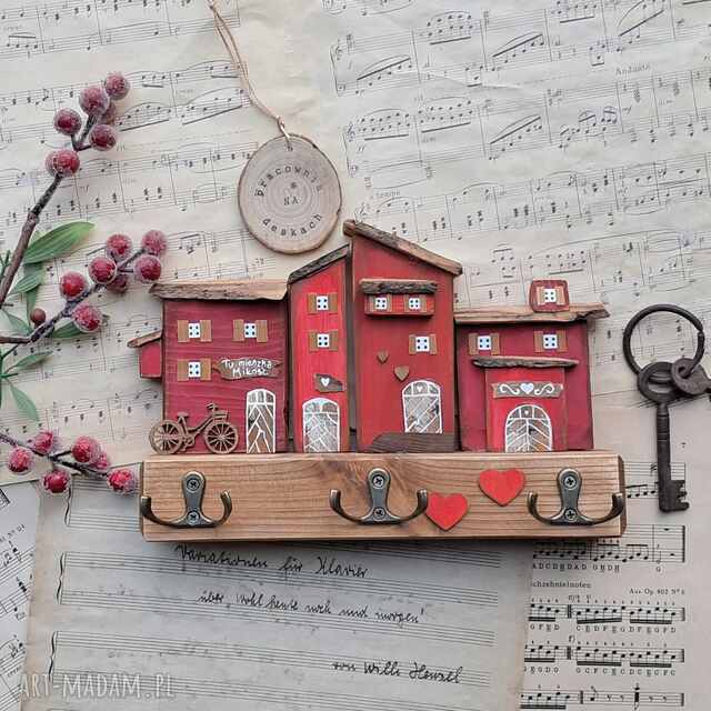 Wieszak w którym mieszka miłość no1. Wieszaki handmade Wieszak z domkami w odcieniach czerwieni wykonany z drewna, przecierany każdy domek inny200,00 zł