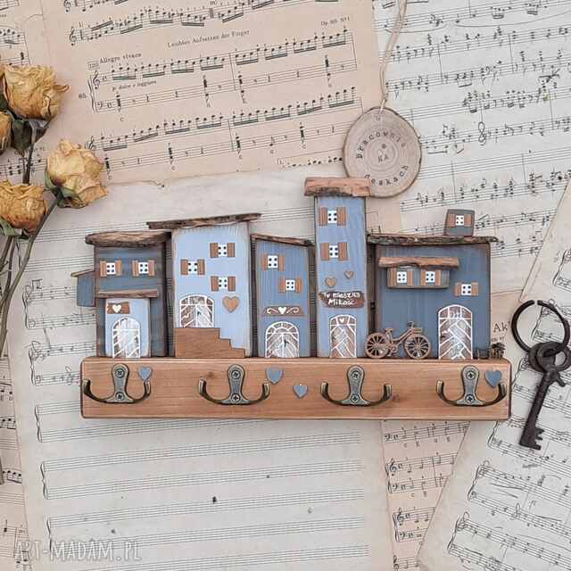 Wieszak z domkami w kolorze szarym z naturalnymi, przecierany, postarzany.