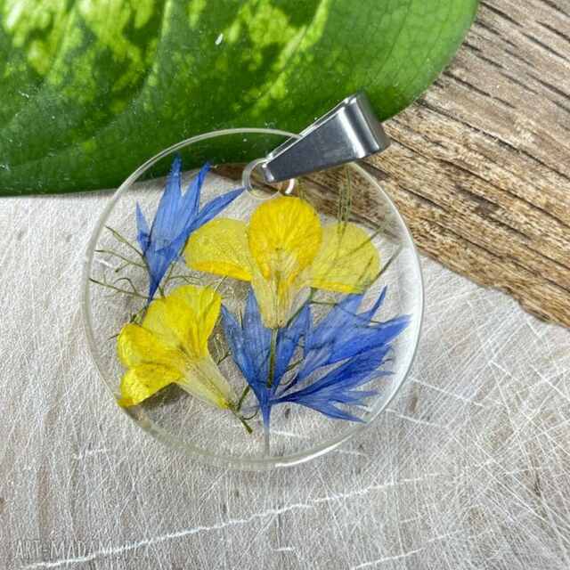 Wisiorek ze słonecznym bratkiem w żywicy z2027. Okrągły - wisiorek wisiorki Wisiorek z suszonym bratkiem to wyjątkowy element biżuterii, Każdy płatek, 5 cm85,00 zł
