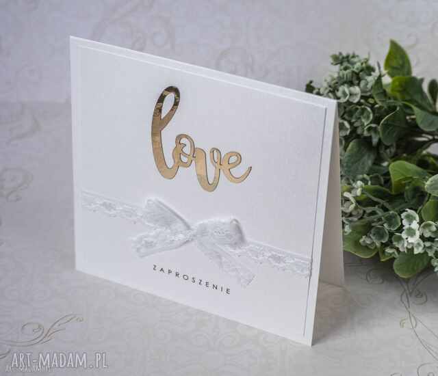 7,65 zł Zaproszenia ślubne wykonane z białego kartonu. W górnej części zaproszenia znajduje się napis LOVE wykonane z kartonu złotego mieniącego się jak lustro. Poniżej jest delikatna koronka z kokardą.